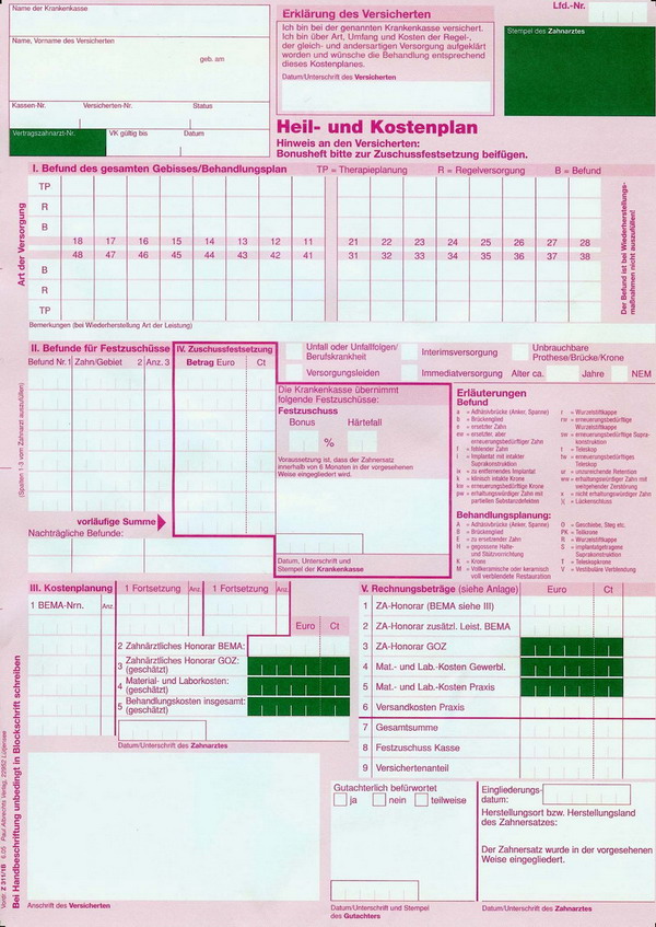 Der Heil- und Kostenplan enthält ein Schema, in das der Befund und Therapiemöglichkeiten eingetragen werden.